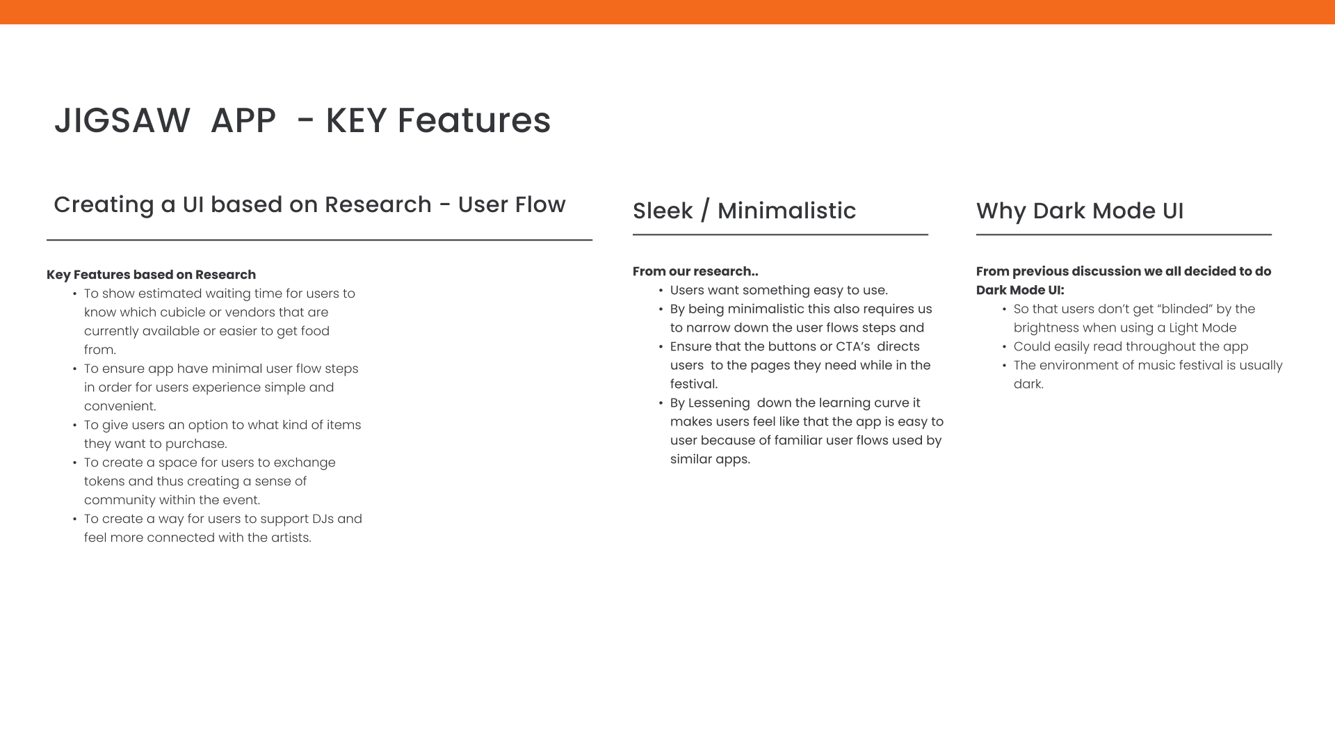 By creating a user persona for Jigsaw through our research we understood ravers more. Thus, summarised that there are mostly two personas. One who plans their concert from buying the ticket to which stages they want to go to and another type of user where they usually go to the flow and makes sure to go to take note the stages of their favourite artist.